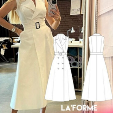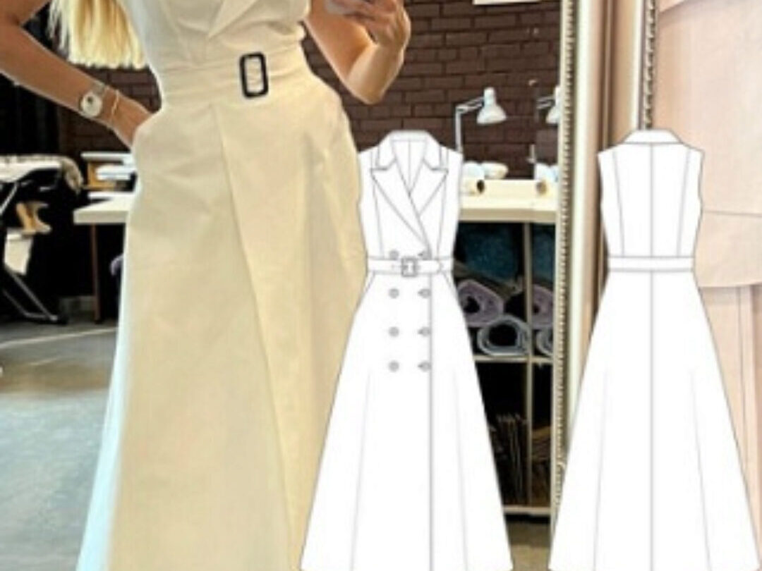 Платье женское прилегающего силуэта, отрезное по талии, для пошива из костюмных тканей. Перед и спинка с вертикальными рельефами, пройма обрабатывается обтачкой. Юбка коническая с боковыми карманами. Воротник пиджачного типа с отрезной стойкой и широкими лацканами. Застежка смещенная, на два ряда петель/пуговиц. В комплекте лекал есть детали подкладки, но изделие может быть выполнено без нее. Пояс съемный.