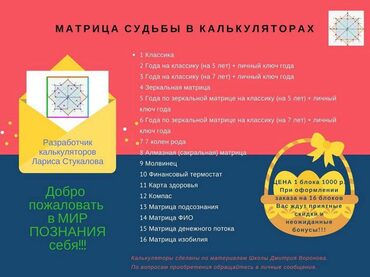Это просто супер облегчение для всех, кто любит матрицу, но не любит бесконечные расчеты. 7 калькуляторов по 1000р за каждый, добавлены расчеты по классической системе таро, где энергии после 22 не складываются, а вычитаются. - Основа - 7 колен рода - Матрица прошлых воплощений - Матрица изобилия -