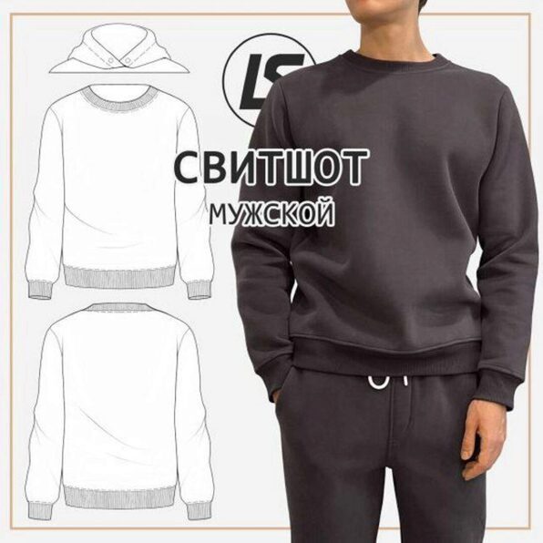 Свитшот базовый мужской умеренного объема, прилегающего силуэта. Рукав втачной, одношовный. Низ изделия с притачным поясом, низ рукава обработан притачными манжетами из отделочного полотна (кашкорсе). Круглая горловина с притачной планкой из кашкорсе. Рекомендуемые материалы: 1. Для изготовления