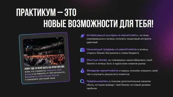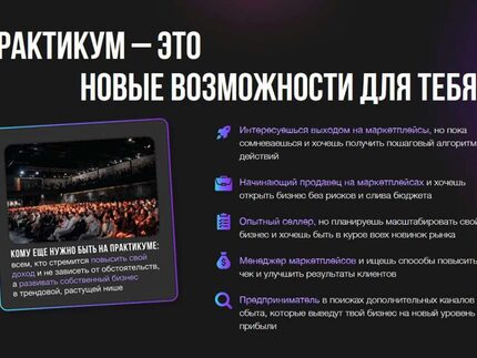 Кому подойдет практикум? Новичкам на маркетплейсах Поймете, как выйти на площадки с миллионной аудиторией и зарабатывать от 150 000/мес. Погрузитесь в экспертную среду, получите знания и инструменты, которых нет в открытом доступе. Начинающим селлерам с оборотом