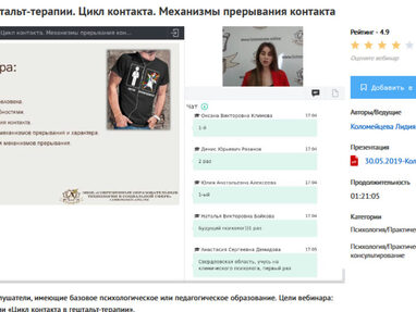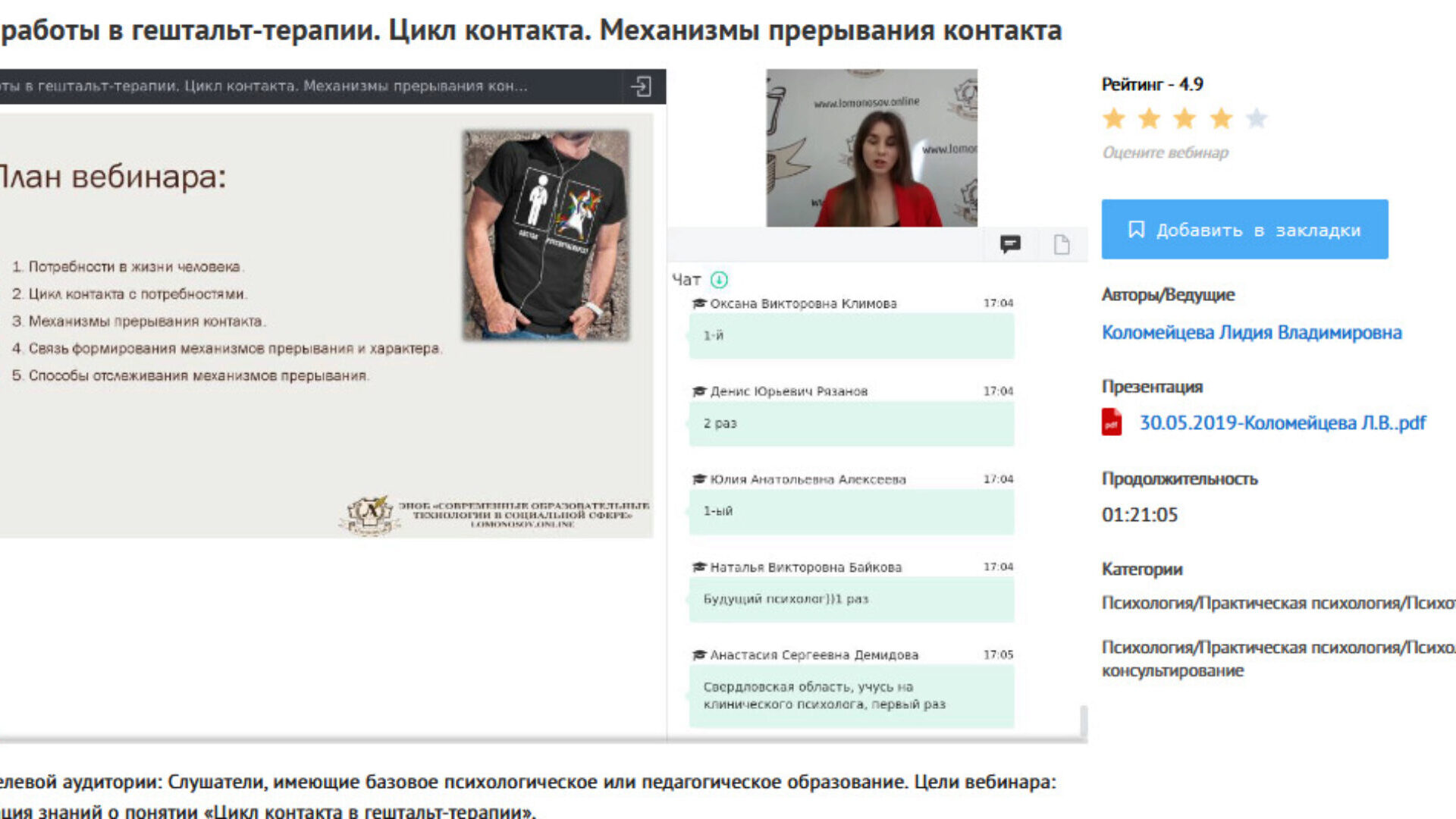 Описание целевой аудитории: Слушатели, имеющие или получающие базовое или дополнительное психологическое или педагогическое образование, практикующие психологи. Цели вебинара: Систематизация знаний и приобретение практических навыков в работе с техникой «Пустой стул» 1. Видеозапись: «Техника