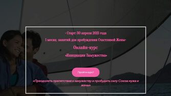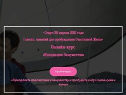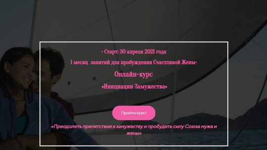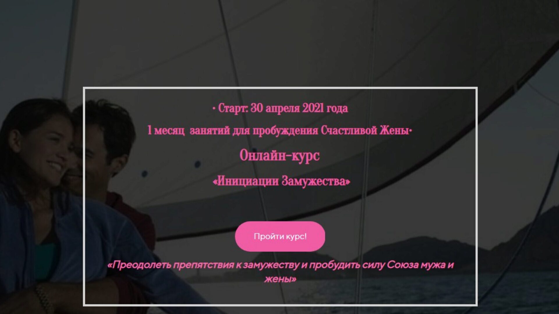 Онлайн-курс «Инициации Замужества» 4 занятия для пробуждения Счастливой Жены Пробуждение Союза мужа и жены «Преодолеть препятствия к замужеству и пробудить силу Союза мужа и жены» Пробужденная Жена – это великий источник первородной животворящей энергии, которая очень вступает во взаимоотношения с