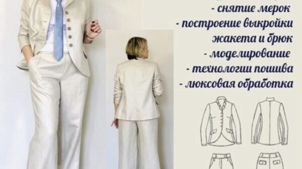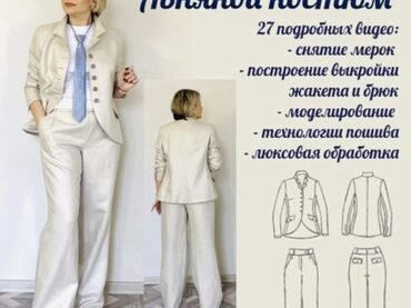 В видеокурсе подробно показано как снять мерки, построить выкройку, смоделировать и сшить жакет и брюки с люксовой обработкой (используется косая бейка)