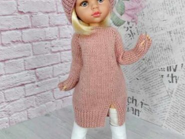 По этому описанию вы сможете связать распашное платьице для куклы с застежкой на пуговицы на спинке. Платье вяжется безотрывно от начала до конца, на двух спицах поворотными рядами. Платье вяжется на спицах №1.5-1.7 + крючок (для сшивания рукава) Пряжа: Alize «Angora Gold» (100 г 550 м) или