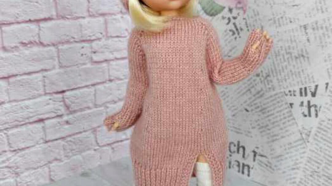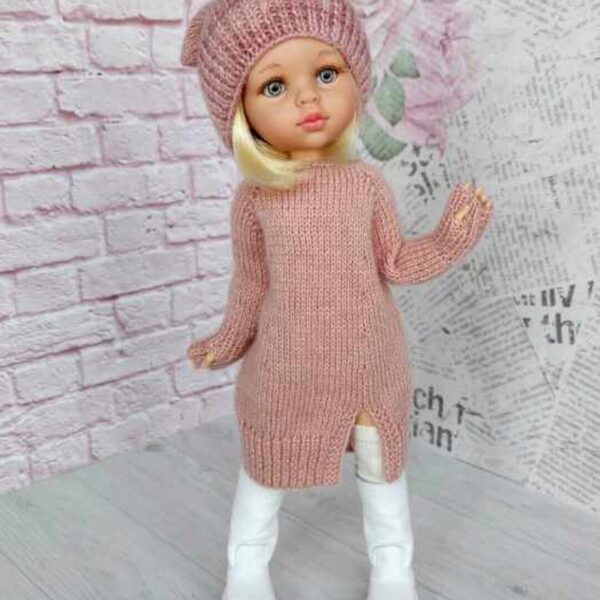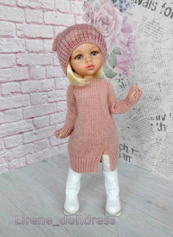 По этому описанию вы сможете связать платьице и шапочку для куклы Паола Рейна или ей подобной. Платье полностью распашное, с застежкой на пуговицы на спинке, вяжется на двух спицах поворотными рядами, рукав сшивается крючком. Шапочка вяжется на 2/5 спицах. Платье вяжется на спицах №1.7-2 + крючок