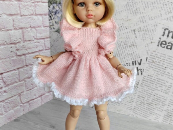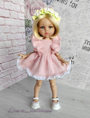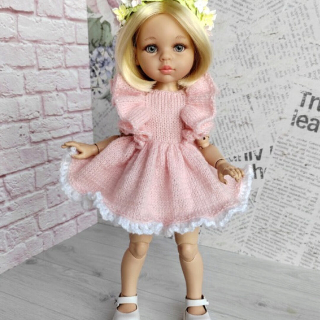 Платье «Ванесса» для кукол Паола Рейна ростом 32-34 см и им подобных. Полностью распашное, с двухслойной юбочкой, на пуговицах. Вяжется на спицах №1.5-1.7 (поворотное вязание). Пряжа: Alize «Angora Gold» (100 г 550 м) или аналогичная, попадающая в плотность. Подойдёт пух норки. Проверяйте плотность