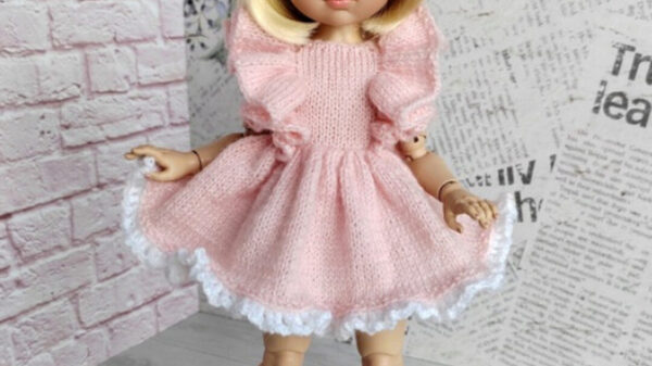 Описание вязания платьица для куколок 21 см серии miniamigas Paola Reina спицами. Полностью распашное платьице-бочонок с кармашками и застежкой на пуговицы вяжется без отрыва нити на двух спицах №1.5 (1.2). Плотность вязания: Полотно 15п+2кр= 4см в ширину. МК в PDF файле на 5 страницах включает в