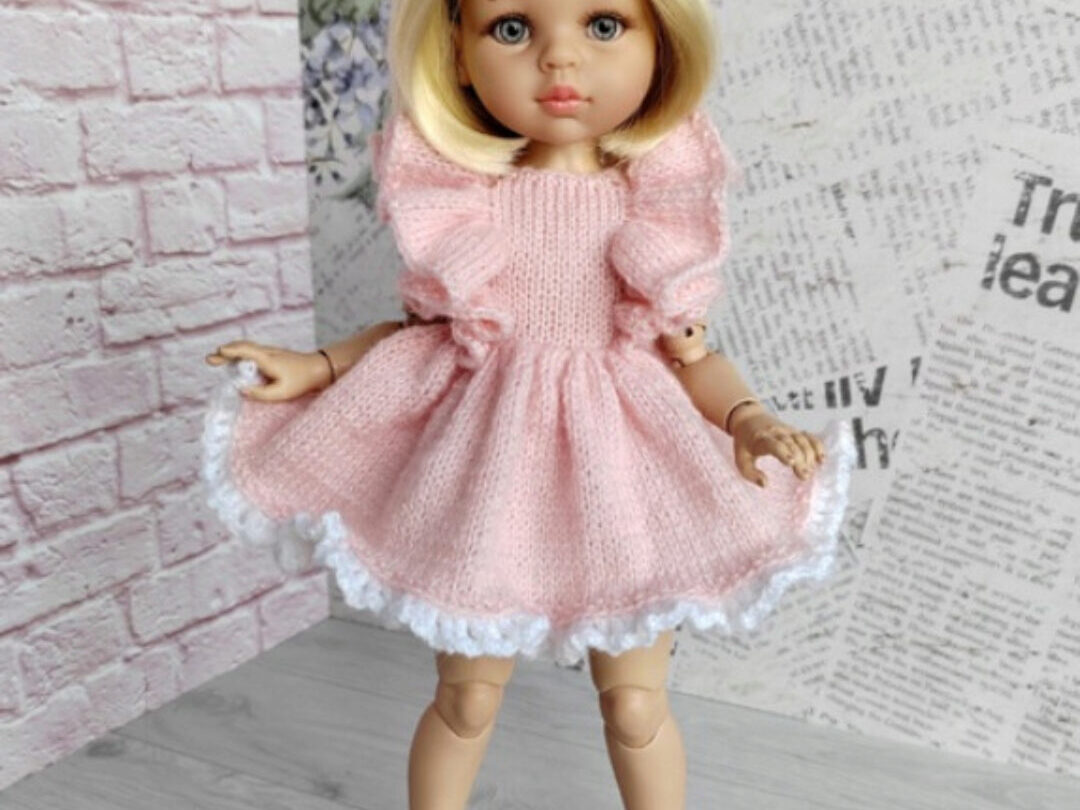 Описание вязания платья для кукол ростом 20-23 см спицами. Модель подходит для кукол Паола Рейна мини 21 см, Крузелингс, Монст и других аналогичных. Распашное платье вяжется на двух спицах №1.7-2 Плотность вязания (по лицевой глади): Полотно 15 петель + 2 кром. = 4,2 см в ширину МК в PDF файле на 6