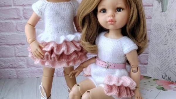 По этому описанию вы сможете связать распашное платьице для куклы с застежкой на пуговицы на спинке. Платье вяжется безотрывно от начала до конца, на двух спицах поворотными рядами. Платье вяжется на спицах №1.5-1.7 + крючок (для сшивания рукава) Пряжа: Alize «Angora Gold» (100 г 550 м) или