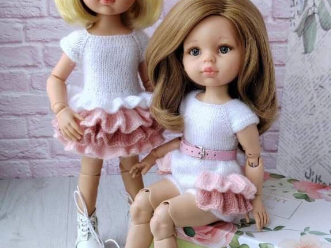 Платье «Ванесса» для кукол Паола Рейна ростом 32-34 см и им подобных. Полностью распашное, с двухслойной юбочкой, на пуговицах. Вяжется на спицах №1.5-1.7 (поворотное вязание). Пряжа: Alize «Angora Gold» (100 г 550 м) или аналогичная, попадающая в плотность. Подойдёт пух норки. Проверяйте плотность