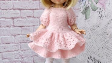 По этому описанию вы сможете связать ажурное распашное платьице для куклы с застежкой на пуговицы на спинке. Платье вяжется безотрывно от начала до конца, на двух спицах поворотными рядами. Платье вяжется на спицах №1.5-1.7 + крючок Пряжа: Alize «Angora Gold» (100 г 550 м) или аналогичная,