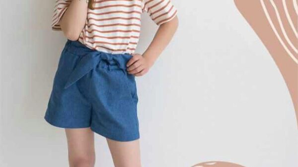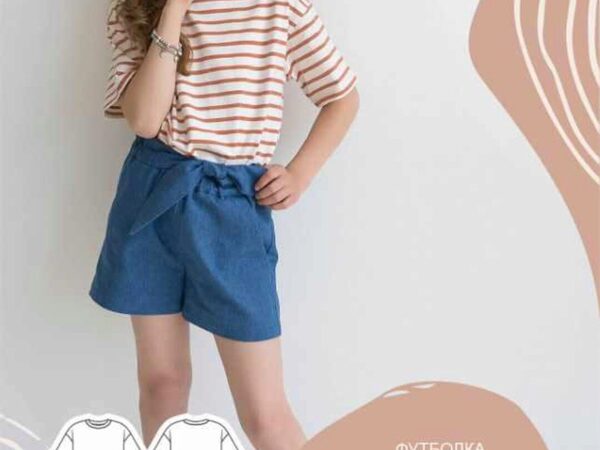 МОДЕЛЬ 1. Футболка короткая. Футболка детская свободного силуэта, длиной выше линии бедер. Округлый вырез горловины обработан бейкой из рибаны. Плечо спущенное. Рукав рубашечного кроя, длиной выше локтя. Низ изделия и низ рукава обработаны на плоскошовной машине.