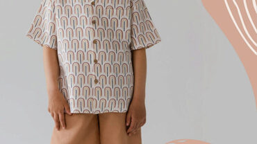 Рубашка умеренного объема, прямого силуэта. На левой полочке – накладной карман. Воротник стояче-отложной. Плечо спущено. Рукав втачной, короткий, выполнен на базе цельнокроеного. Застежка центральная на прорезные петли и пуговицы. Длина изделия ниже линии бедер.
