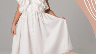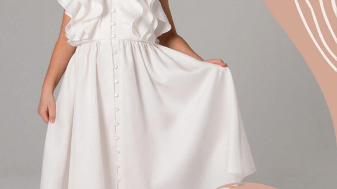 Платье детское среднего объема, отрезное по линии талии. Линия талии слегка завышена. Округлый вырез горловины оформлен оборкой. На переде лифа фигурная кокетка. По линии втачивания кокетка оформлена оборкой со сборкой. На спинке застежка на навесную петлю и пуговицу, разрез оформлен