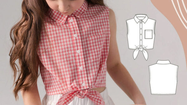 Рубашка умеренного объема, прямого силуэта, без рукавов. С левой стороны переда - накладной карман. По низу переда оформлены завязки. Воротник рубашечный, отложной на отрезной стойке. Застежка - планка центральная на кнопки. Проймы рубашки обработаны бейками. Длина изделия чуть ниже талии.