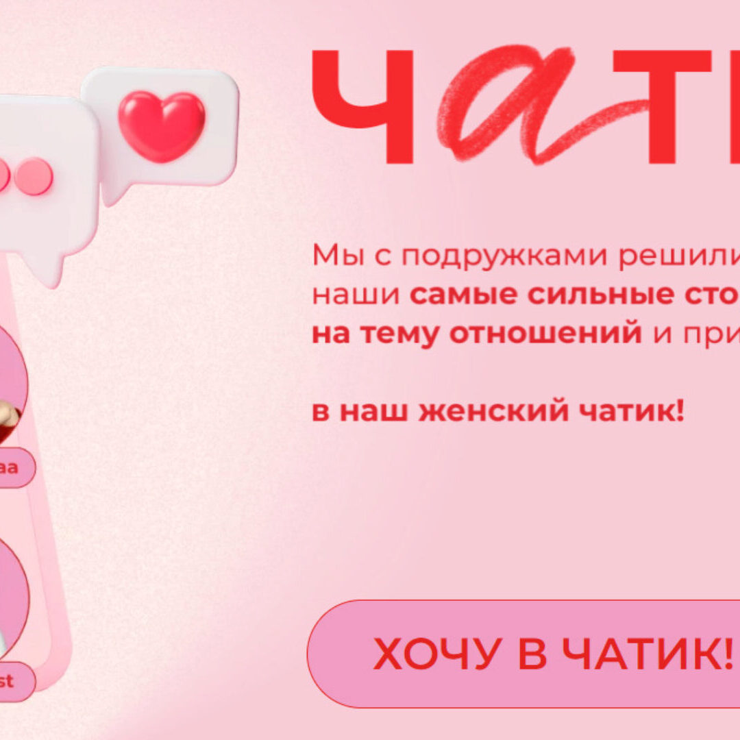 Чатик - это проект от нас четверых, благодаря которому ты сможешь стать ТОЙ САМОЙ, неповторимой и незабываемой в любых отношениях, сможешь ВЛЮБИТЬ В СЕБЯ ЛЮБОГО, зная его дату рождения и, наконец-то, стать СЧАСТЛИВОЙ, неважно, есть сейчас у тебя мужчина или ты одна!