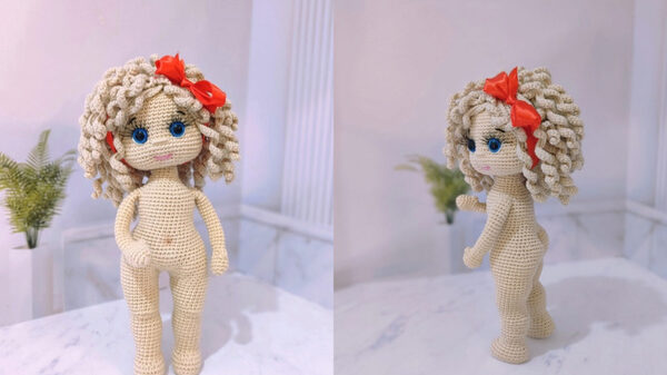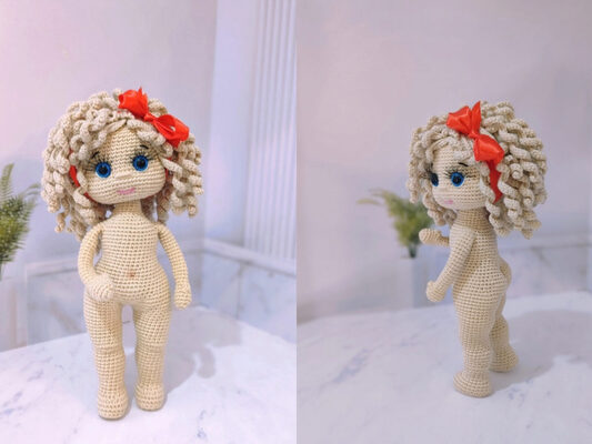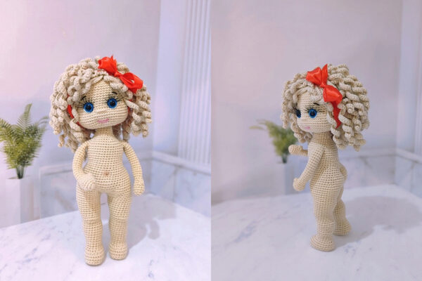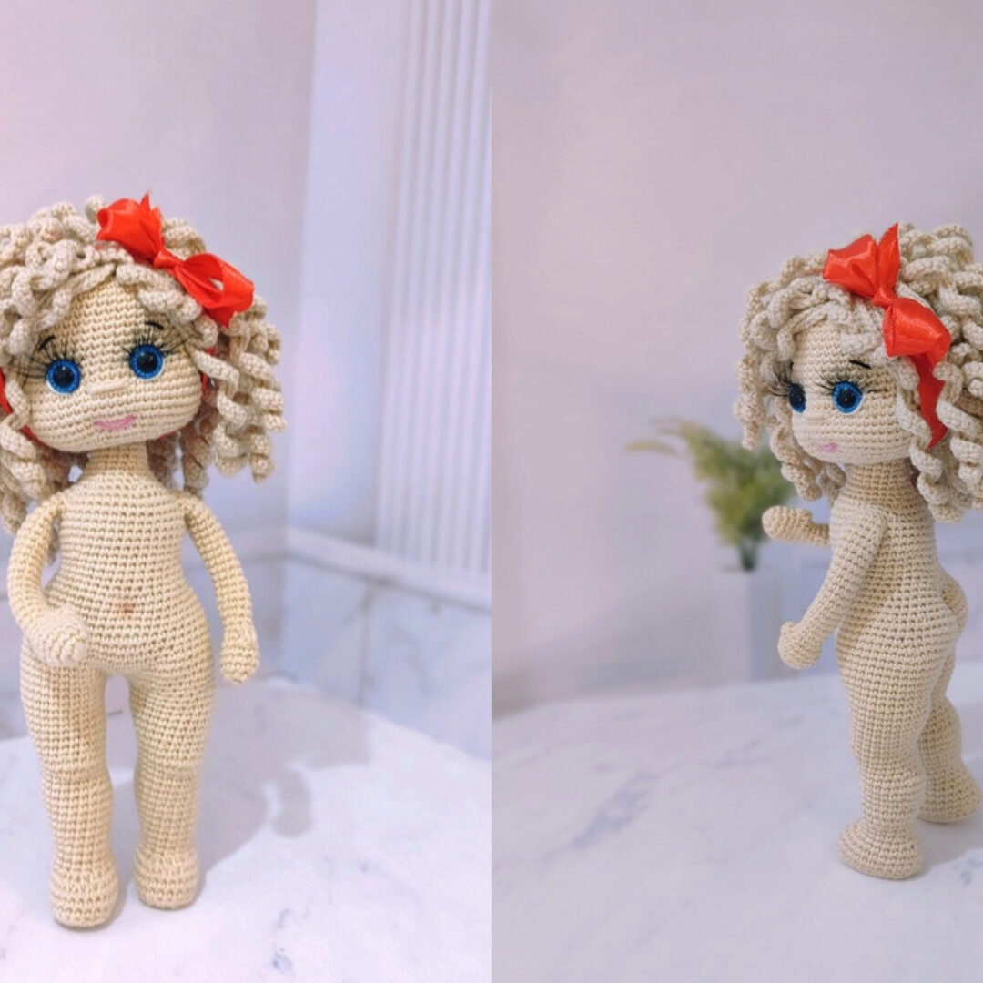 Куколка ростом 28 см.На каркасе. В МК входит описание платья, туфелек, трусиков, повязки на голову.
