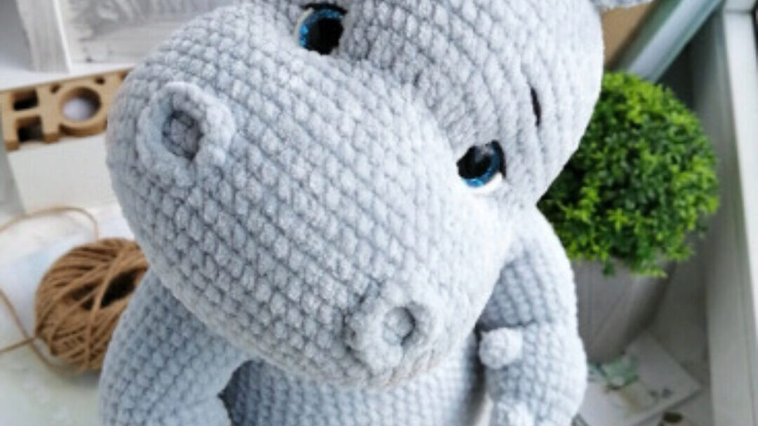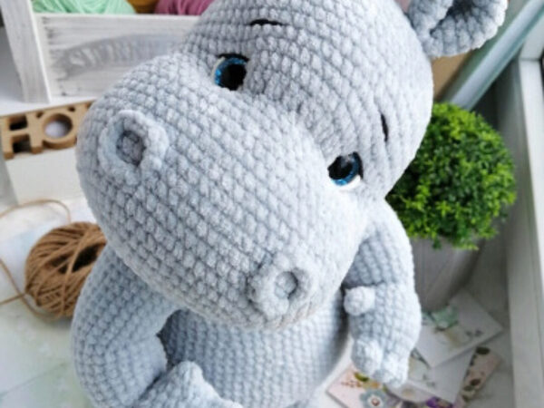 Ослик вяжется из стандартной плюшевой пряжи 100гр/120м. Ноги и руки ввязываются в тело, голова на шплинтовом креплении. Ростом игрушка получается примерно 33-34 см.