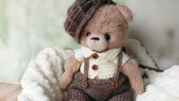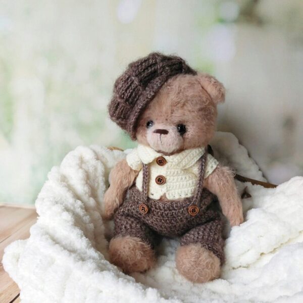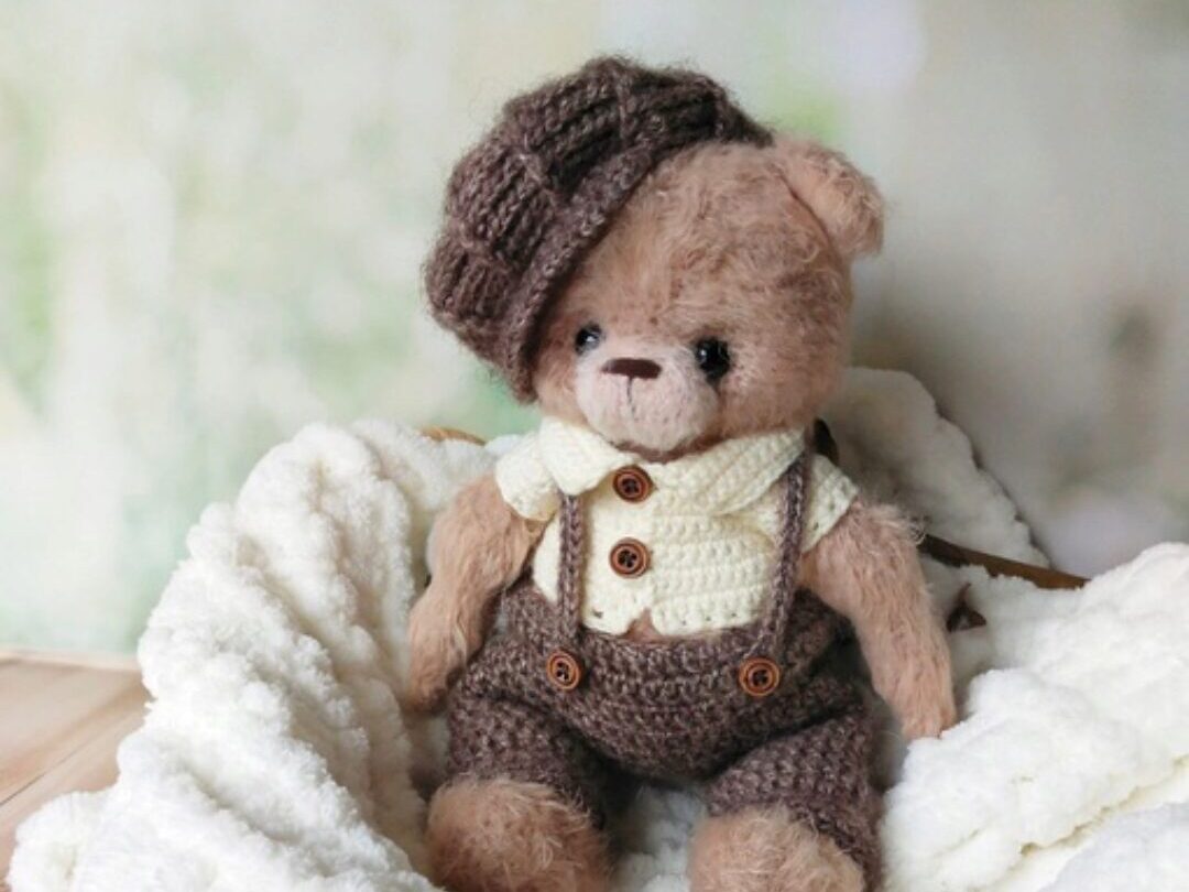 МК содержит подробное описание вязания мишки, брюк, рубашки и кепки.