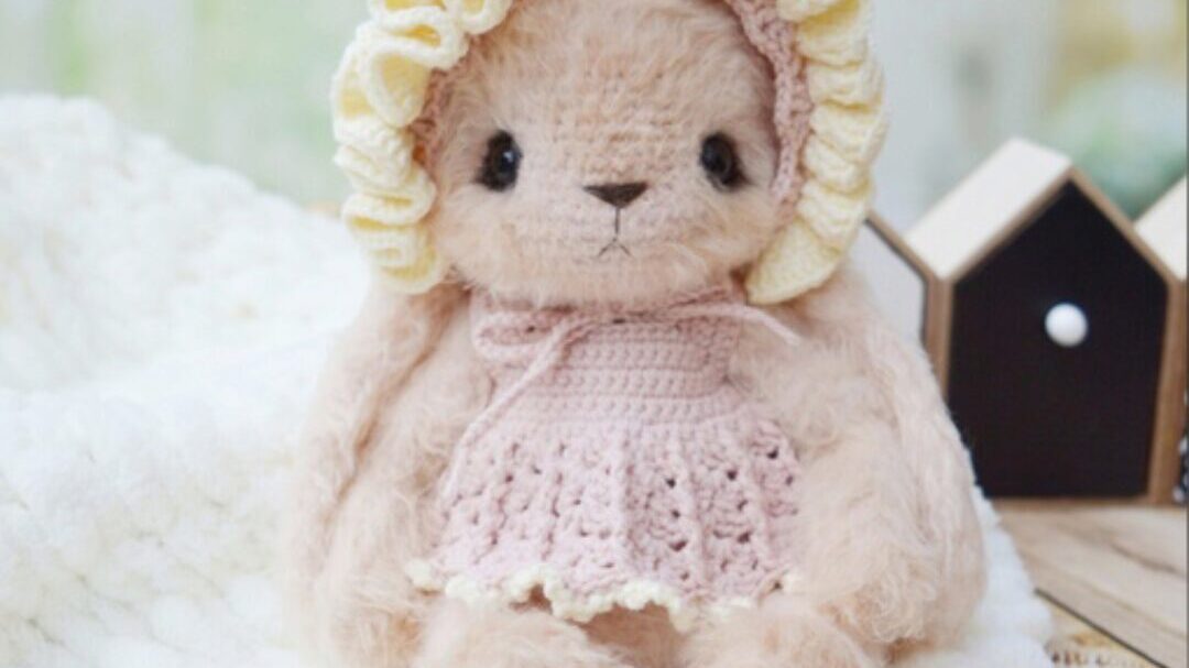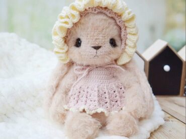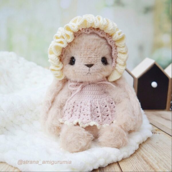 МК содержит подробное описание вязания зайки, платья и чепчика.