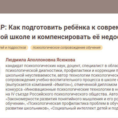 Людмила Аполлоновна Ясюкова, кандидат психологических наук, доцент, специалист в области психологической диагностики, профилактики и коррекции причин школьной неуспеваемости, автор технологии психологического сопровождения учебно-воспитательного процесса в школе с 1 по 11 класс (выпускается компанией «Иматон»), отмеченной дипломом лауреата конкурса «Инновационные психологические технологии в новом столетии» на IV съезде Российского психологического общества. Автор книг «Закономерности развития понятийного мышления и его роль в обучении», «Психологическая профилактика проблем в обучении и развитии школьников», «Социальный интеллект детей и подростков».