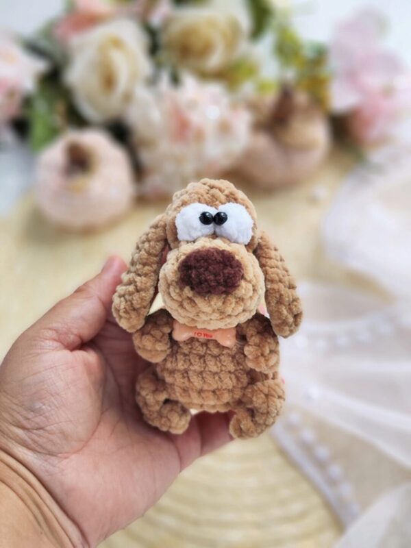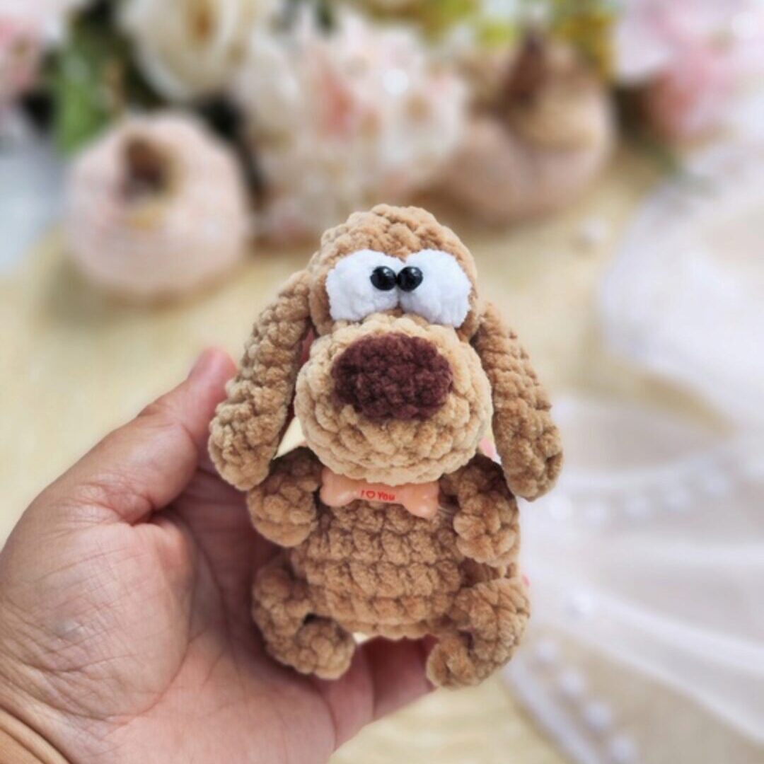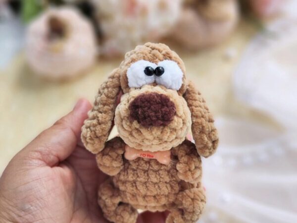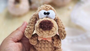 Игрушка вяжется снизу вверх одной деталью. Лапки, глаза и хвост вывязываются по ходу вязания тела. Морда вяжется отдельно и ввязывается в голову.