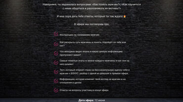 Интенсив для тебя, если: Устала от постоянного обесценивания себя и своих проблем Стремишься обрести уверенность в себе и гармонию в жизни Хочешь стать магнитом для подарков, комплиментов, достойного окружения и щедрых мужчин Уже забыла, каково это – слышать слова восхищения и видеть огонёк в