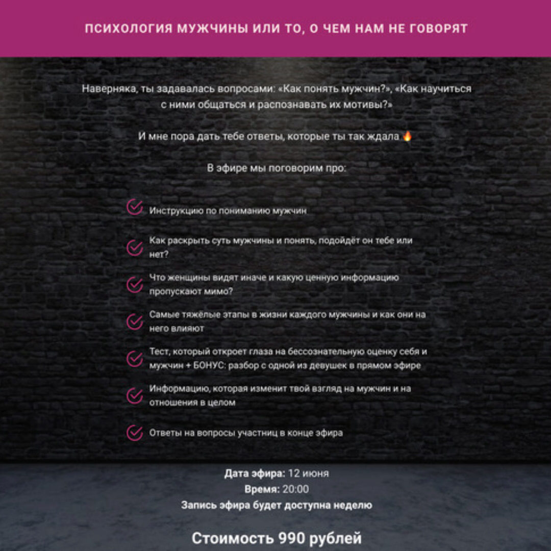 В ходе данного курса разбираем вопросы: Как Мужчина выбирает именно эту Женщину из целого «моря» предложений? Какое поведение Женщины заставляет Мужчину действовать? Как Мужчина мыслит при первой встрече? Как решается жениться? Что мотивирует? Почему не хочет на мне жениться? Как заставить его