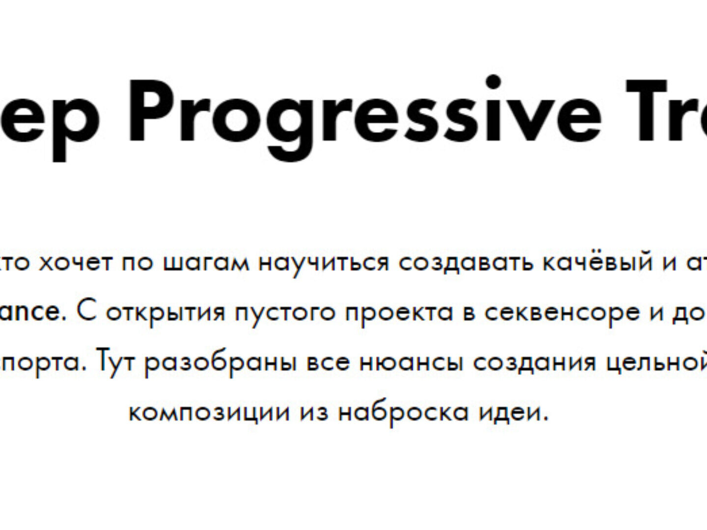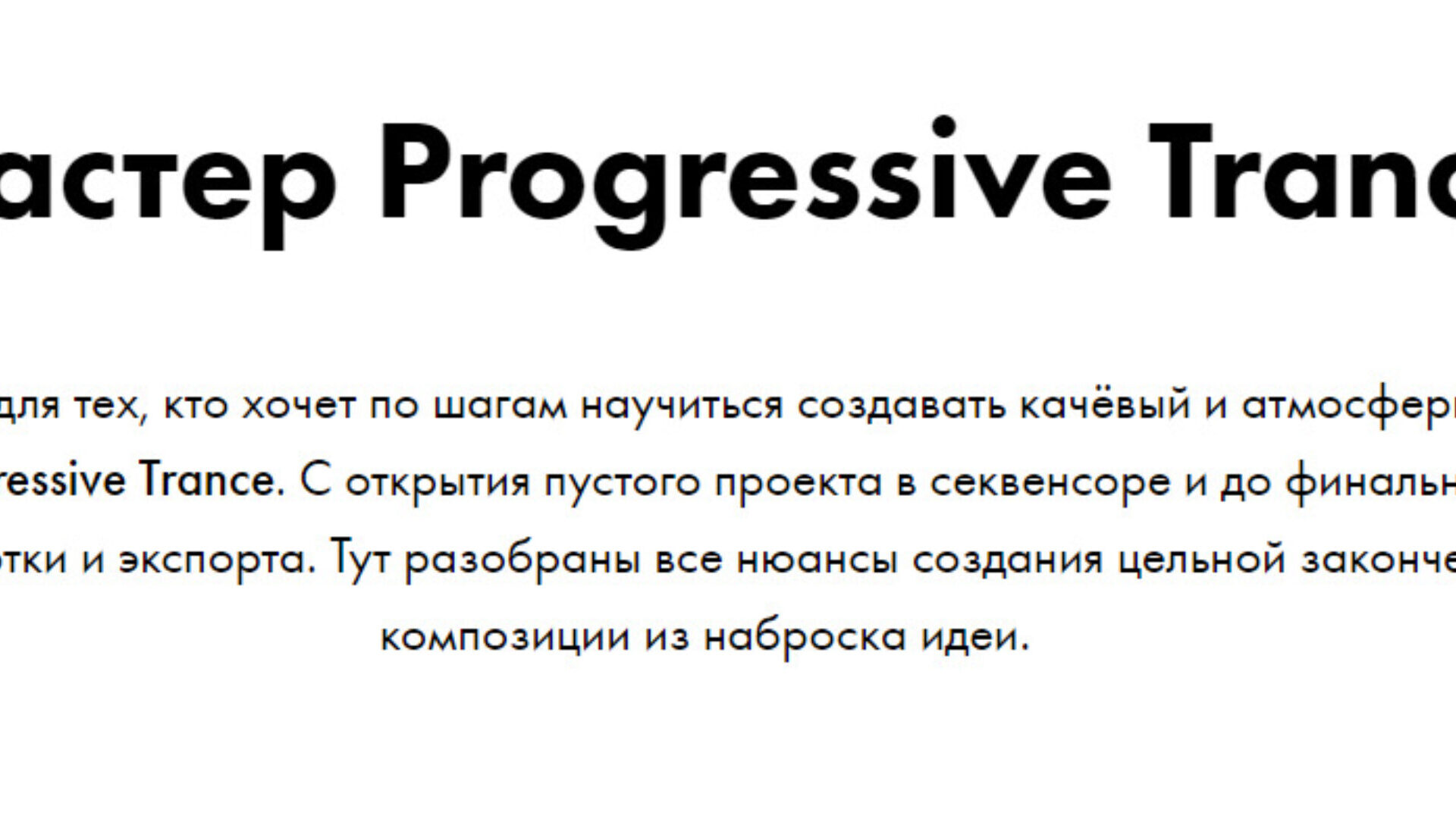 В этом курсе вы будете по шагам создавать качественный Progressive Trance трек. Изучите все характерные для данного стиля особенности: атмосферный и плотный звук, танцевальный кач и грув, глубокая яма и пространственное заполнение.
