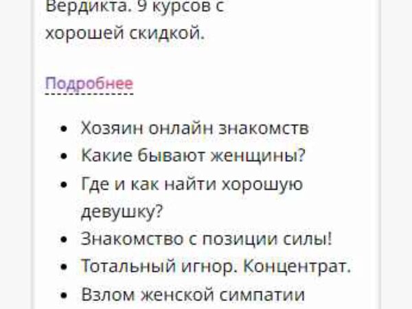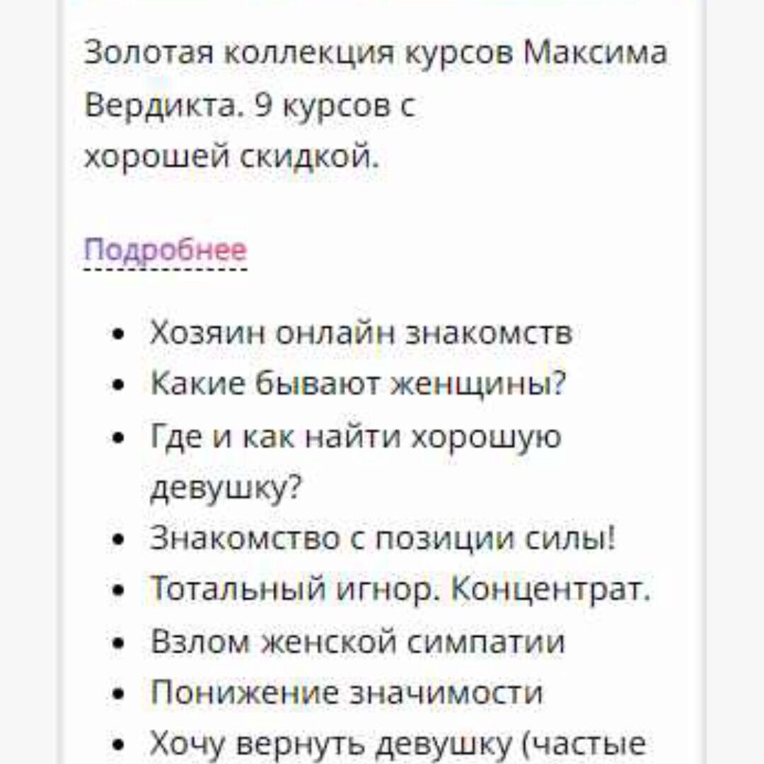 Золотая коллекция курсов Максима Вердикта. 8 курсов с хорошей скидкой. Подробнее - Хозяин онлайн знакомств - Какие бывают женщины? - Ты ничего не знаешь о женщинах! - Знакомство с позиции силы! - Тотальный игнор. Концентрат. - Взлом женской симпатии - Понижение значимости - Хочу вернуть