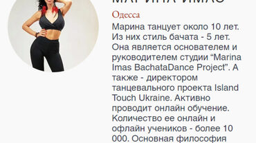 Марафон «Женственность через танец» О авторе: Я, Марина Имас. Мне 44 года. Танцую 11 лет. Обучила более 3000 учеников на онлайн и оффлайн занятиях. Поделюсь с вами не только всеми тонкостями Бачаты - танца, захватившего весь мир, но и опытом сохранения красоты и молодости на долгие годы. Почему