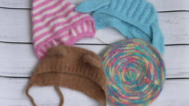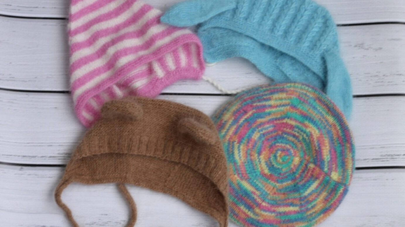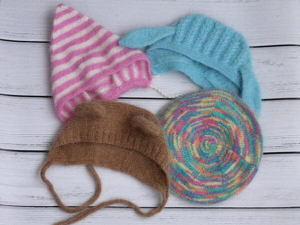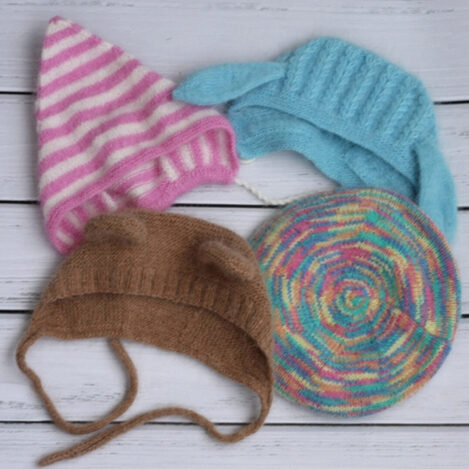 Текстовое описание вязания шапочек спицами. Опыт вязания обязателен. В описание входит 1 основа и 3 варианта оформления шапочки: зайка, мишка, уточка.
