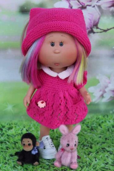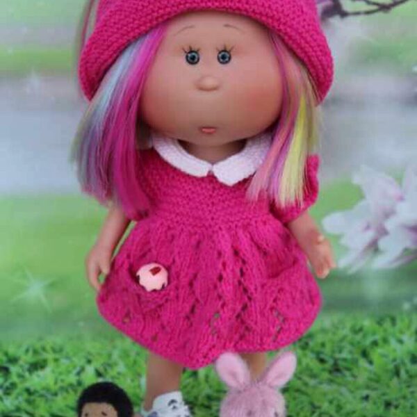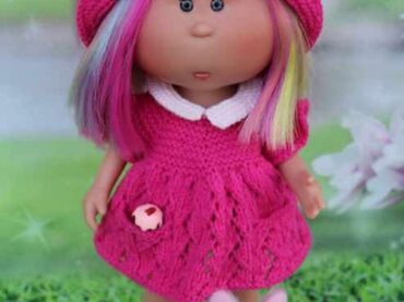 Комплект состоит из полукомбинезона с застежкой спереди на пуговках, украшенного декоративным «сердечком» из шишечек, из аккуратного, кругленького беретика, выполненного платочной вязкой, украшенного помпоном и пальтишка с переходами цвета, с воротником, связанного платочной вязкой. Нам