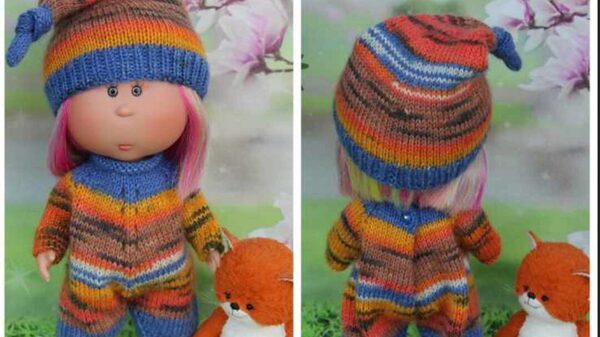 Комплект состоит из полукомбинезона с застежкой спереди на пуговках, украшенного декоративным «сердечком» из шишечек, из аккуратного, кругленького беретика, выполненного платочной вязкой, украшенного помпоном и пальтишка с переходами цвета, с воротником, связанного платочной вязкой. Нам