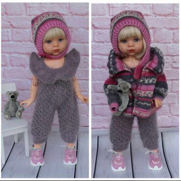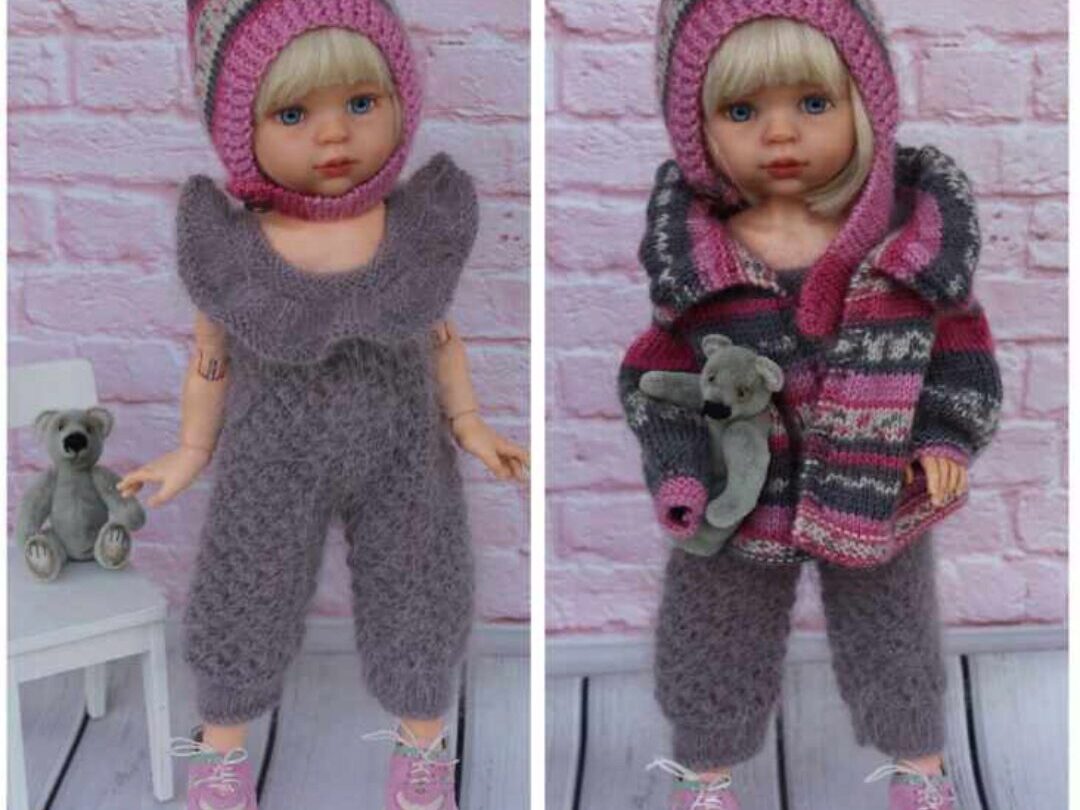 Комплект состоит из полукомбинезона с застежкой спереди на пуговках, украшенного декоративным «сердечком» из шишечек, из аккуратного, кругленького беретика, выполненного платочной вязкой, украшенного помпоном и пальтишка с переходами цвета, с воротником, связанного платочной вязкой. Нам