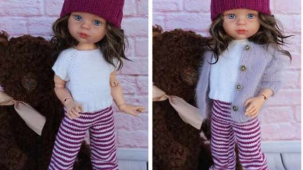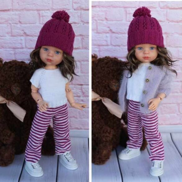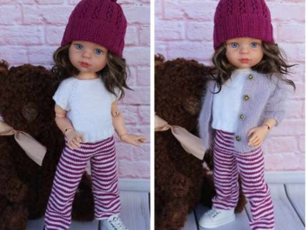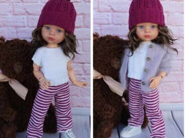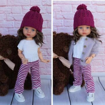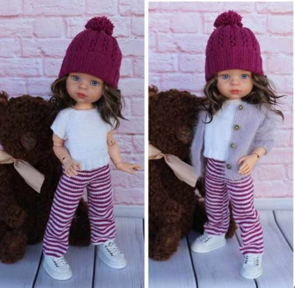 По этому описанию вы сможете связать платьице и шапочку для куклы Паола Рейна или ей подобной. Платье полностью распашное, с застежкой на пуговицы на спинке, вяжется на двух спицах поворотными рядами, рукав сшивается крючком. Шапочка вяжется на 2/5 спицах. Платье вяжется на спицах №1.7-2 + крючок