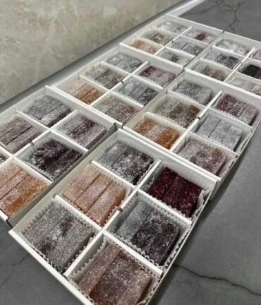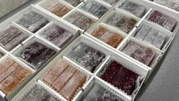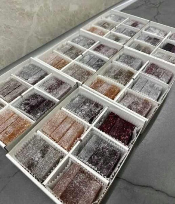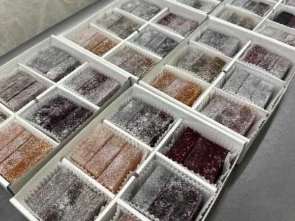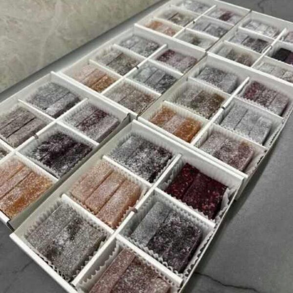 В классическом рецепте мармелада идет больше 1 кг сахара на кг фруктового пюре. В моем рецепте я уменьшила сахар почти в 2 раза от классического рецепта! Мармелад получается сочный внутри, не приторный и при этом абсолютно стабильный! Он не течет после обсыпки, остается таким же сочным и упругим!