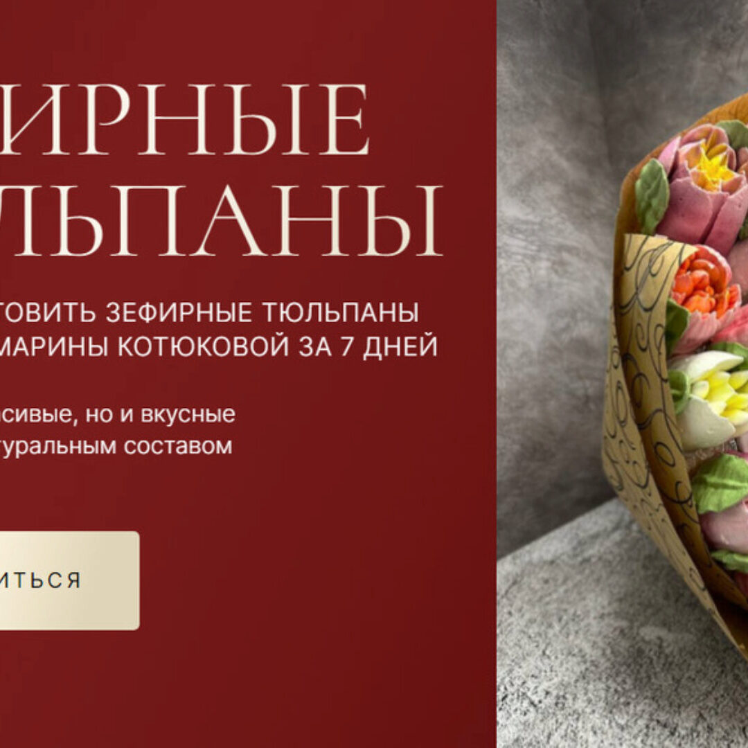 Тариф Самостоятельный. Шикарные махровые и классические Все что я знаю о зефирных тюльпанах, узнаете и вы. Научитесь «выращивать» их и создавать прекрасные композиции Что входит в курс: 6 видео приготовления всего более 25 видео 2 рецепта: на пюре и на соке приготовление яблочного пюре для
