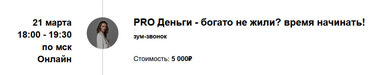 Зум-звонок «PRO Деньги - искусство отпускать» Дата: 20 марта (среда) Время: 19:00-20:30 по мск Формат проведения: Онлайн Держитесь за каждую купюру, как за последнюю? Как на счет того, чтобы расслабиться с деньгами и позволить им уходить и приходить беспрепятственно? Запись звонка будет направлена