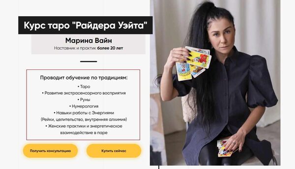 Курс Марины Вайн по таро - это авторская методика Марины, по которой она обучает уже более 15 лет. Программа онлайн-курса Таро полностью перенесена с годового очного обучения Марины. Курс адаптирован к тому, чтобы после его прохождения ученики начинали работу с клиентами. Курс содержит в себе не