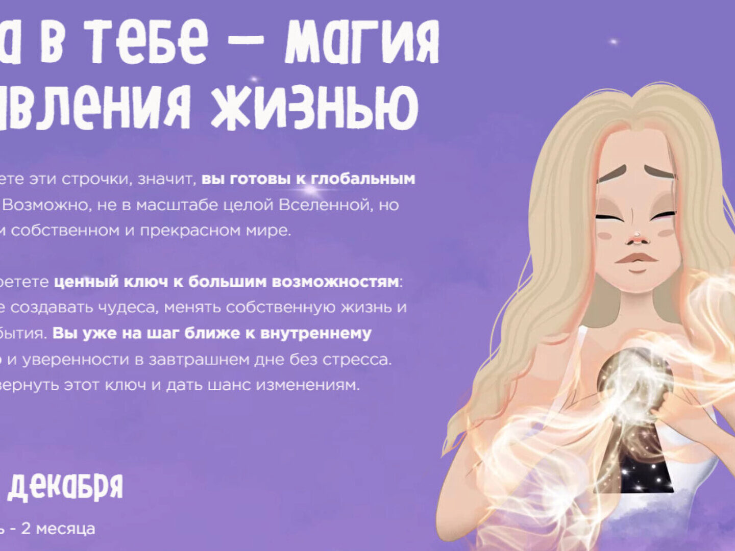 «Новая жизнь» — это интенсив-встряска, который выдернет вас из привычной жизни и откроет глаза на то, что происходит на самом деле. Вы увидите сценарий, по которому жили долгие годы, и напишете новый. Тот, в котором вы будете главной героиней своей жизни, а не второстепенным персонажем. Программа