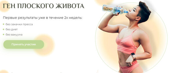 ГЕН ПЛОСКОГО ЖИВОТА: Первые результаты уже в течение 2х недель: - без закачки пресса; - без диет; - без вакуума РЕЗУЛЬТАТЫ КУРСА Плоский живот, который не надо втягивать Уменьшение диастаза Повышение либидо и яркости оргазмов Устранение недержания Улучшение самочувствия Снижение уровня стресса