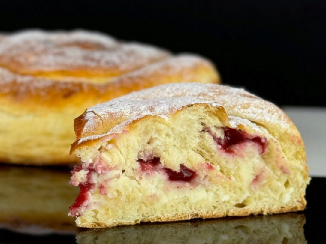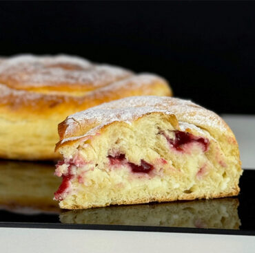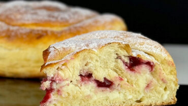 Очень нежный вкус всего изделия, мягкая начинка внутри из сыра рикотты и все покрыто слусом из малины, который запекается вместе с тестом.
