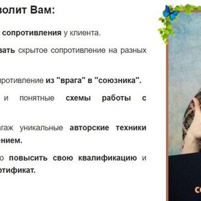 5. Получить в свой багаж уникальные авторские техники работы с сопротивлением.