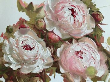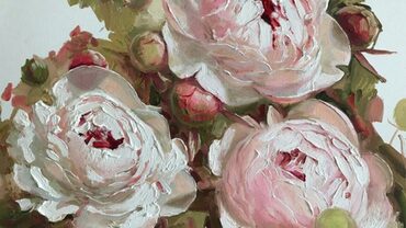 Научимся изображать маслом прозрачное стекло, разберём как правильно построить отражения, напишем чудесные пышные пионы в роспуске и в бутонах.