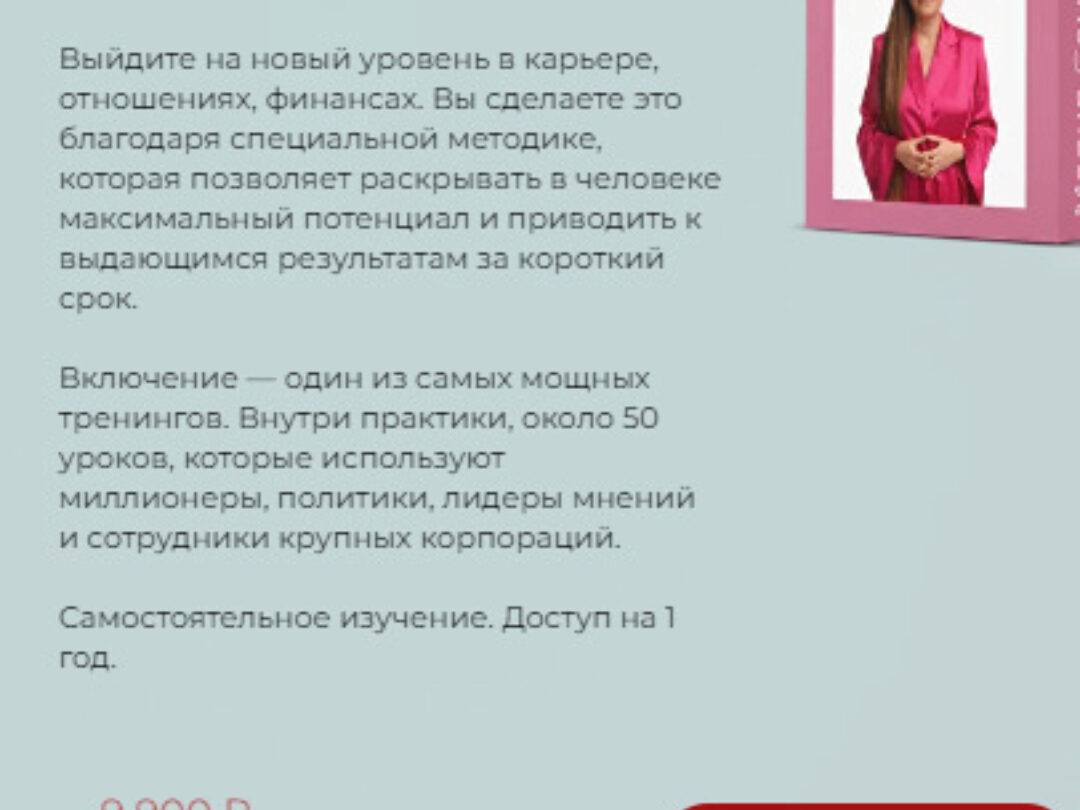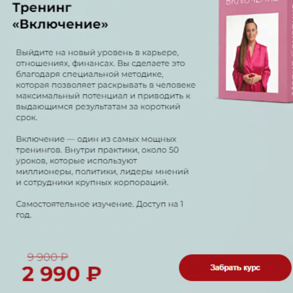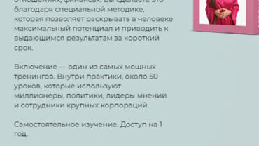Включение — один из самых мощных тренингов. Внутри практики, около 50 уроков, которые используют миллионеры, политики, лидеры мнений и сотрудники крупных корпораций.