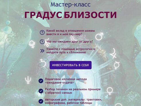 Участие в МК онлайн продолжительностью ~ 2 часа Опорные авторские методички: «Фигуры Джонса» (обновленный материал с примерами от клиентов), «Стрела компенсации», «Стихии и кресты», «Планетарная лестница» Рабочая тетрадь для подробного анализа 10 техник, каждая из которых – важный шаг в алгоритме