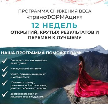 Тариф Все сама Программа снижения веса «трансФОРМАция» 12 недель открытий, крутых результатов и перемен к лучшему Спойлер: Автор Мария Волкова Психолог, нутрицевт, сертифицированный специалист по питанию и снижению веса Нажмите для раскрытия...