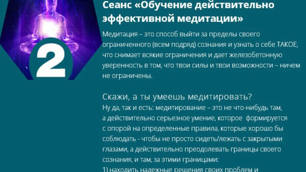 Видеосессия «Программирование себя… на что угодно» Если тебе не надо доказывать, что своё подсознание можно запросто программировать на любые задачи и тем самым обеспечивать беспрепятственное и точное решение этих задач, да ещё без приложения натужных усилий, то этот сеанс для тебя. На сеансе