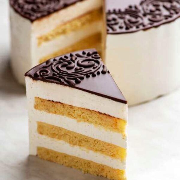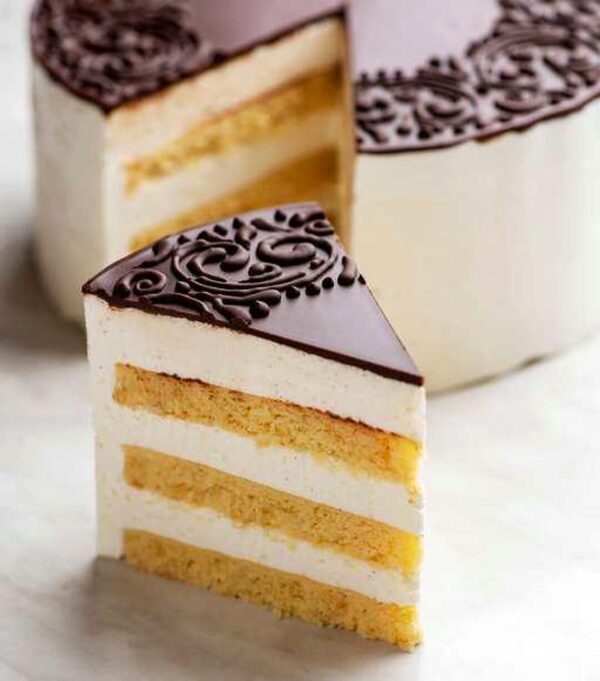 Этот торт был одним из самых популярных десертов в нашем детстве. Классическая версия торта состоит из суфле на основе агар-агара, одного слоя бисквита и тонкого слоя шоколадной глазури. В этой версии торта 3 слоя бисквита вместо одного, поскольку мы все любим печеные текстуры. Кроме того несколько слоев бисквита дают нам более красивый разрез и делают торт менее сладким.